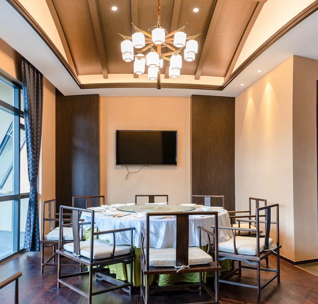 酒店的“老屋酒楼”依水而建,伫立在古老的风水池塘一侧,装修古朴典雅,每个包厢名称皆采用客家民俗文化命名,有过山溜、茶篮灯、采茶戏、香火龙、客家傩等11个景观包厢,室内外318个餐位,其中最大包厢可容纳25人,每个包厢均蕴涵客家文化。