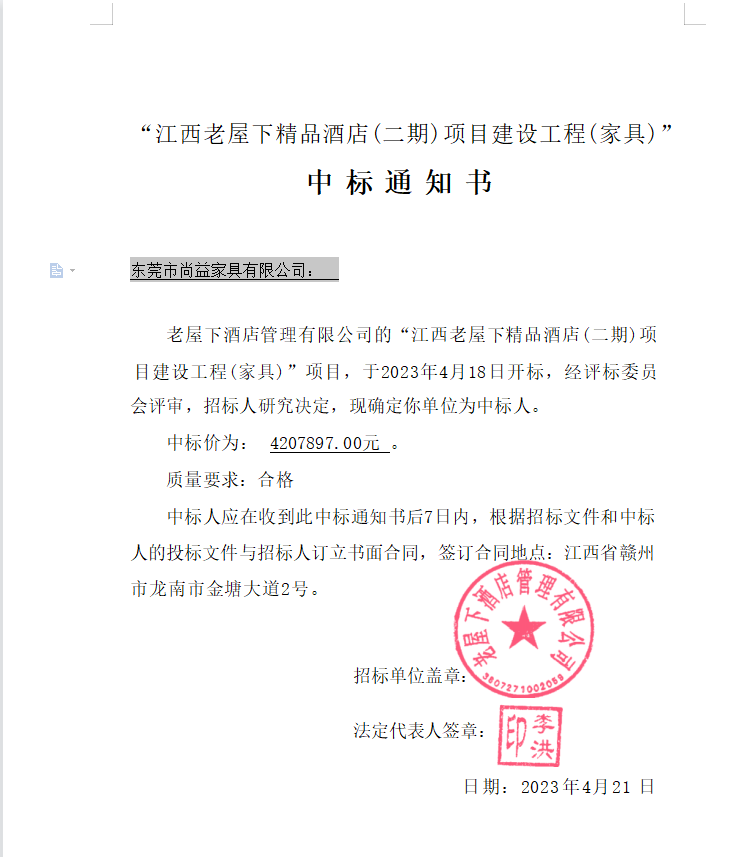 江西老屋下精品酒店(二期)项目建设工程(家具)
